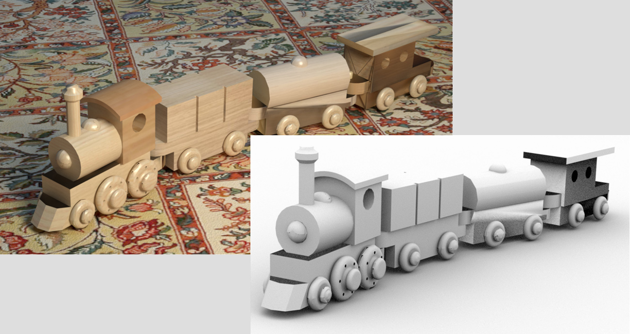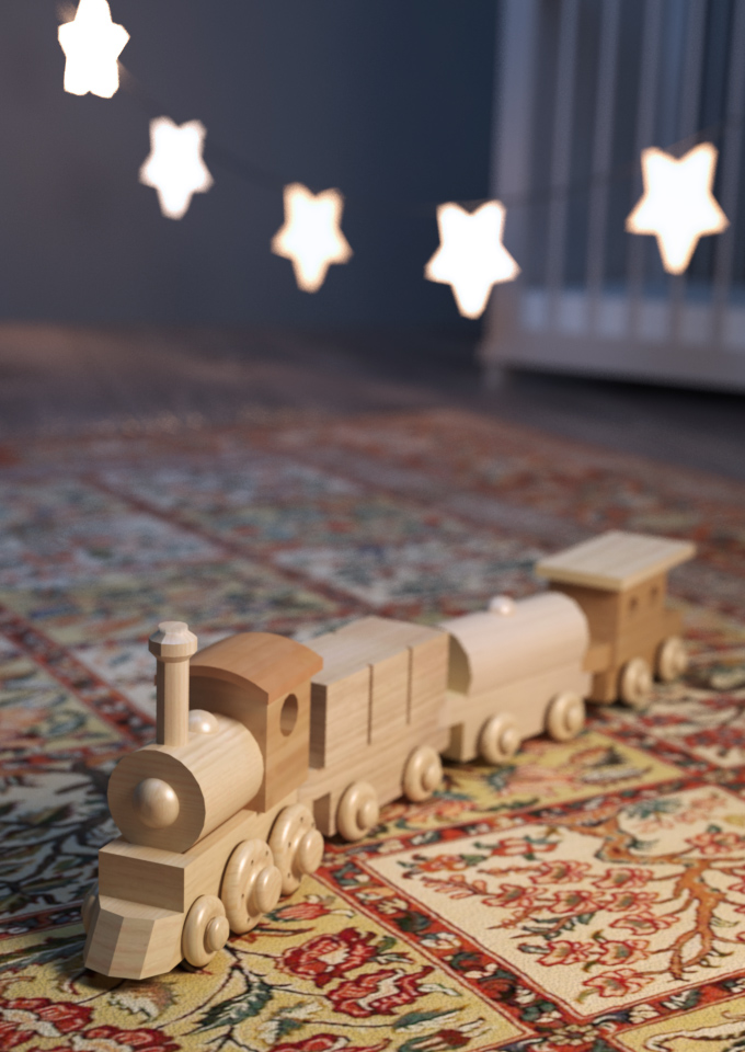 Die Idee für die Szene ist das Rendering einer Spielzeugeisenbahn aus Holz in einem Kinderzimmer. Der Zug steht fahrbereit zum Spielen auf dem Teppich des Zimmers. Die Andeutung einer Lichterkette und eines Babybetts sollen den flüchtigen Eindruck des Kindeszimmers erreichen. Als Titelseite für das das Buch „Rendering in Maya und V-Ray“ soll die Szene möglichst viel von den Besonderheiten von Chaos Groups V-Ray enthalten.