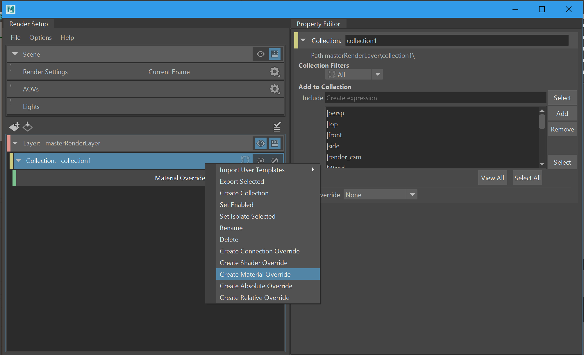 Für das Light Balancing wird ein neuer Render Layer mit einem Material-Override angelegt. Seit Maya 2017 ist der unter Channel Box / Layer Editor zu findende Kartenreiter nicht mehr verfügbar. Render Layer werde nun über einen eigenen Dialog erzeugt, der unter Windows | Rendering Editors > Render Setup zu finden ist. Mit der Schaltfläche Create a render layer kann ein neuer Layer angelegt werden. Als nächstes muss im Menü über die rechte Maustaste mit Create Collection eine neue Collection erzeugt werden. Per Drag & Drop kann die gesamte Szene aus dem Outliner in den Property Editor der Collection gezogen werden. Ruft man mit der rechten Maustaste erneut das Menü auf, findet sich nun der Menüpunkt Create Material Override, für den wir ein VRayMtl auswählen und ein Rendering der Szene beginnen.